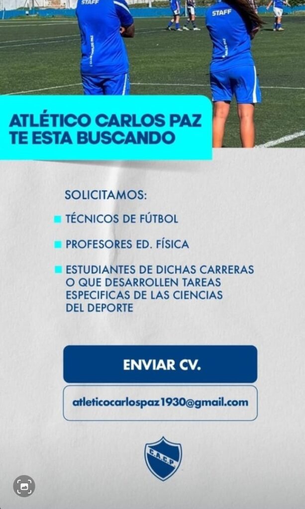 Atlético Carlos Paz, cuyo manager deportivo es Agustiín Díaz, el exvolante central forjado en el club y que tuviera trascendencia nacional en Talleres, está a la búsqueda de profesionales para que integren el Área Fútbol del club. Solicita técnicos, profes de educación física y estudiantes de esas carreras o que desarrollen tareas específicas en […]