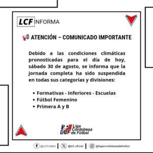 El ente rector sacó un comunicado oficial con la cancelación de los partidos de este sábado. «La Liga Cordobesa de Fútbol informa que, debido