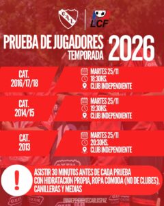 Las pruebas estarán a cargo del equipo de entrenadores del fútbol formativo y se harán en “La Frontera” estadio del Rojo. La invitación es abierta para todos los jugadores que deseen continuar creciendo dentro de un proyecto deportivo que sigue afianzándose en la competencia provincial.