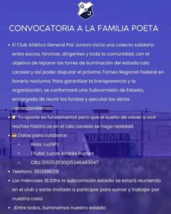 La agrupación partidaria de General Paz Juniors «La 1914» arrancó una colecta solidaria entre hinchas, socios, allegados y público general que desee colaborar con el club para reparar las torres de iluminación del estadio «Lalo Lacassia», un requisito indispensable para poder participar en el Torneo Regional Federa Amateur que se avecina