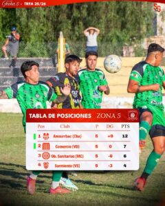 El segundo clasificado se definirá entre Comercio de Villa Dolores (7 puntos), que recibirá este domingo a Obras Sanitarias de Mina Clavero.