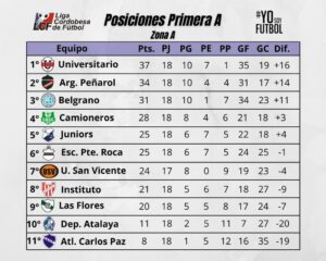 La “U” le ganó 2 a 1 como local a Unión San Vicente, con un doblete de su goleador Kevin Martínez -Sartiru descontó para el Naranja- y sigue como líder con 37 puntos, pero “la Peña” también se impuso -2 a 1 como visitante del Atlético Carlos Paz, con tantos de Ayrton Lovaiza y Gonzalo Rodriguez- y le sigue pisando los talones como su escolta, con 34.